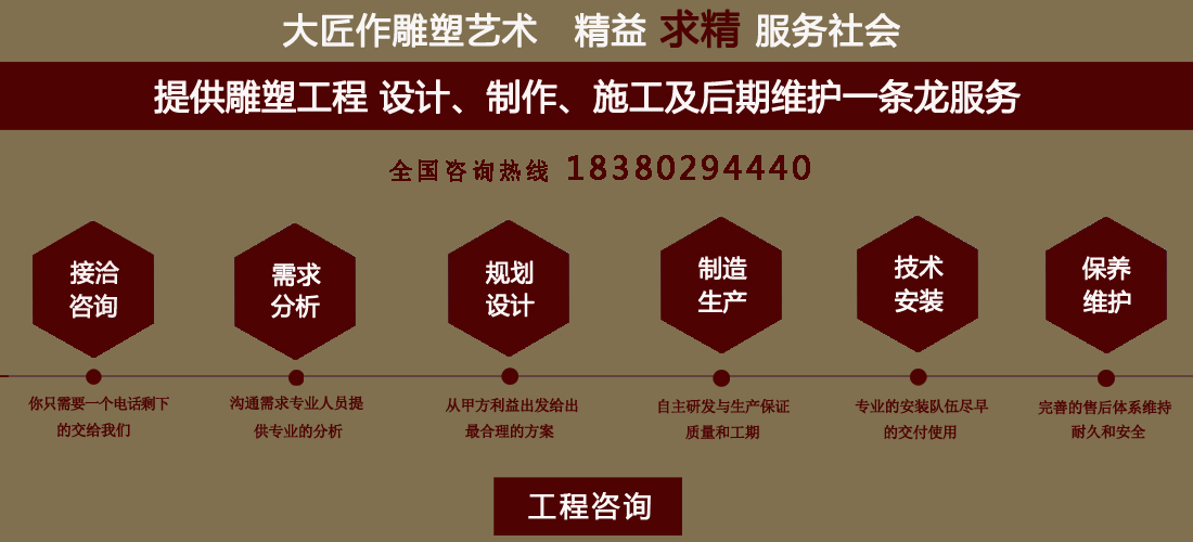成都大匠作雕塑有限公司,是經成都工商局審定注冊的正規(guī)專業雕塑制作及工程安裝服務機構,是由一群年輕富有朝氣的年輕人創辦,發(fā)軔于四川省成都市龍泉驛區。它是一家******于創作、制作和銷售為一體的公司。大匠作擁有多年從事公共藝術的專業人員和雕塑制作人組成的核心團隊,為您提供專業、具創新的設計及制作服務。公司成立以來,秉承“******服務、誠信為本”的宗旨,以客戶需求為目標導向,不斷學習,進取,優(yōu)化和提高服務質量,公司向您******——“您的滿意***是我們的信譽”,我們將以飽滿的熱情和******的服務贏得您的贊譽和支持。